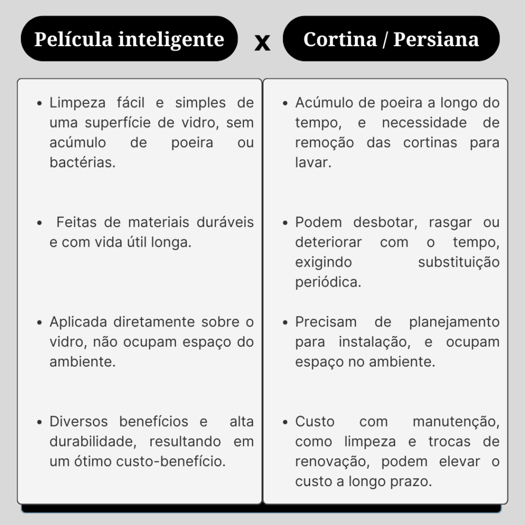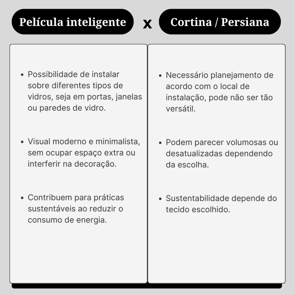 E se você está passando por esse dilema na escolha, trouxemos um comparativo entre essas opções, mas já adiantamos que se ideia é alinhar tecnologia, eficiência e modernidade, as películas inteligentes são ideais, e proporcionam diversos benefícios a ambientes residenciais e corporativos.